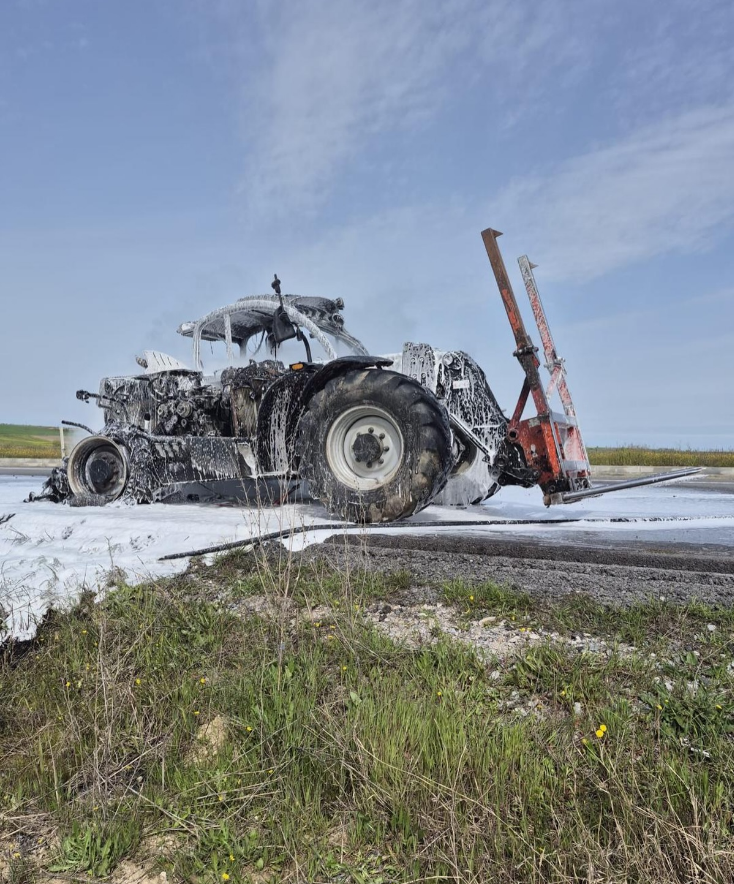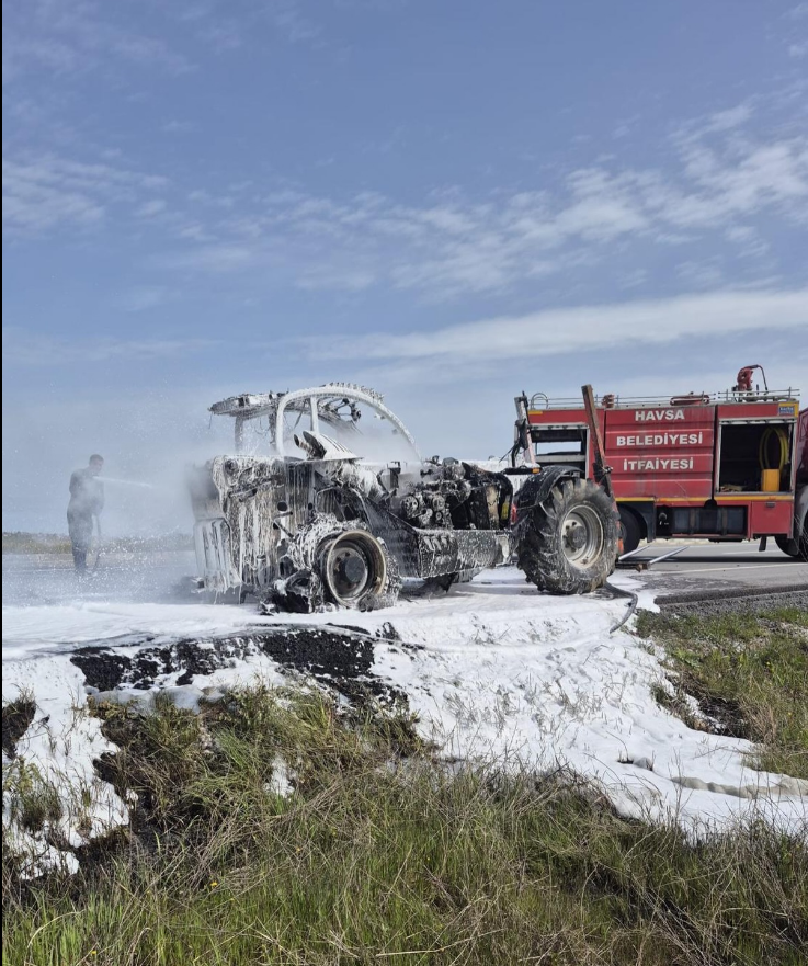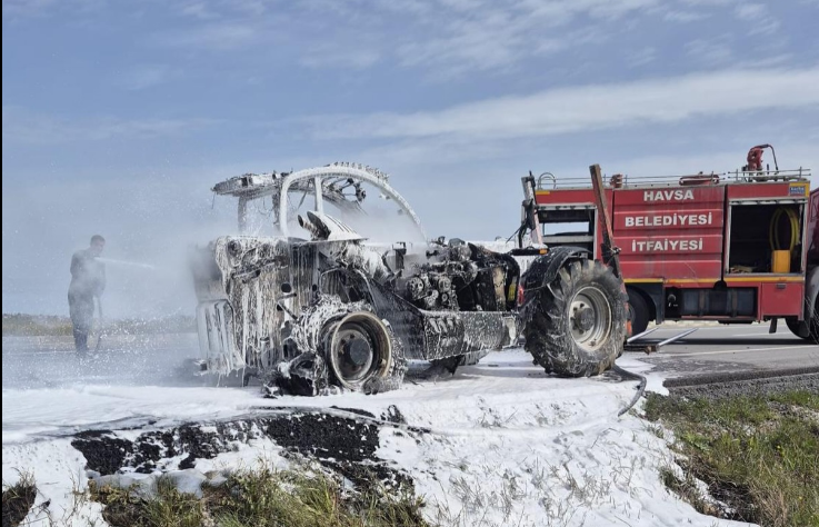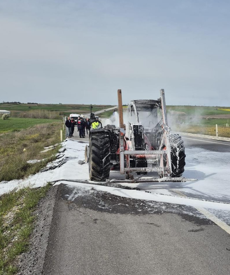 Kırklareli–Edirne yolu üzerinde seyir halindeki bir iş makinesinde çıkan yangın paniğe neden oldu.