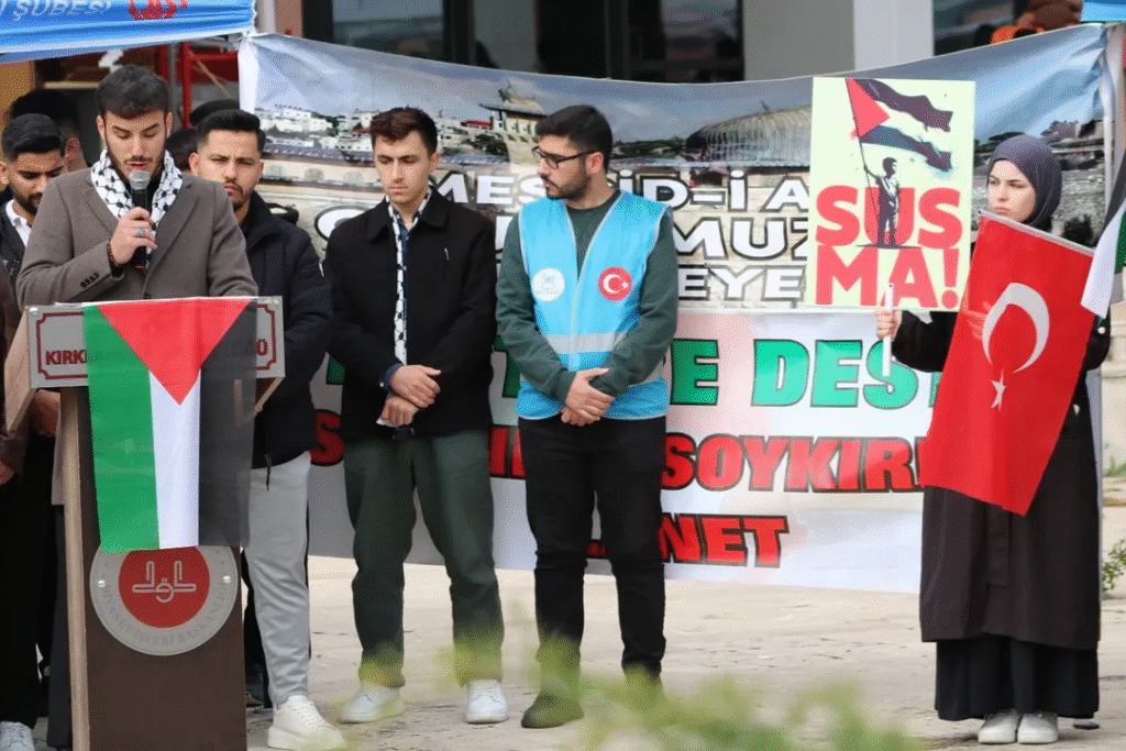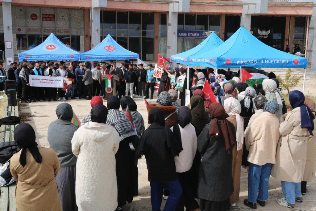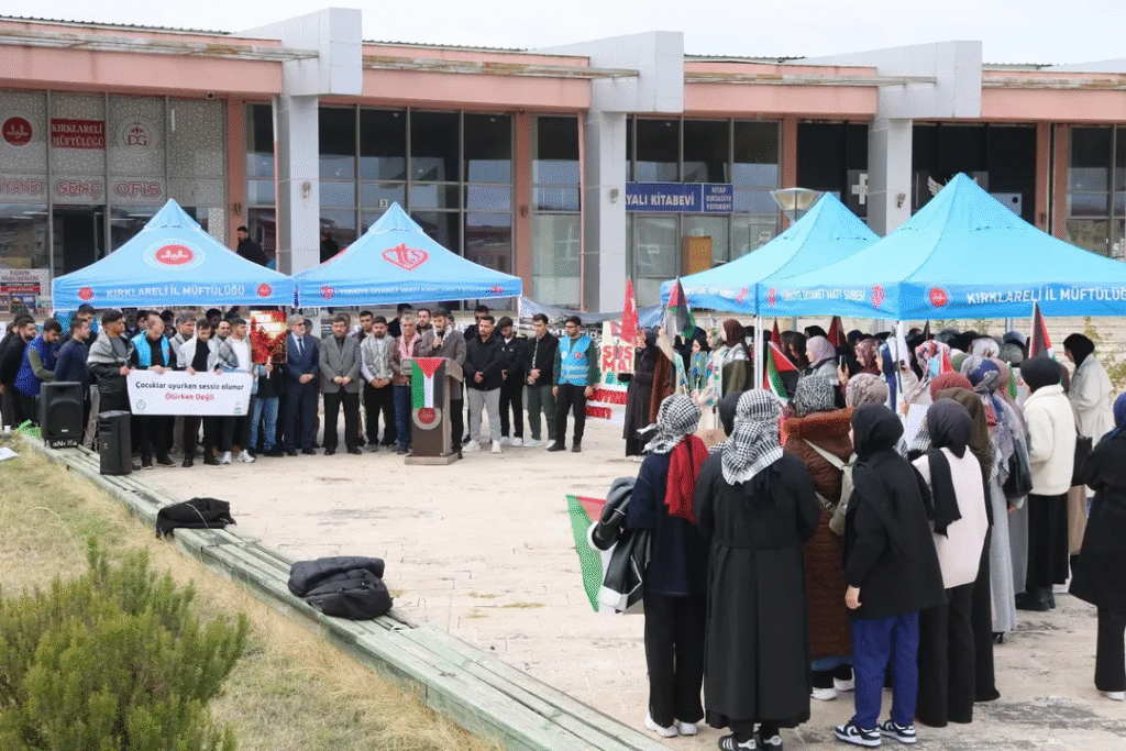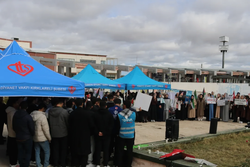 Kırklareli Üniversitesi yerleşkesinde, Filistin ve Gazze’de yaşanan zulme dikkat çekmek amacıyla bir basın açıklaması düzenlendi. Etkinlik, Türkiye Diyanet Vakfı Kırklareli Şubesi ve Kırklareli İl Müftülüğü’nün organizasyonuyla gerçekleştirildi.