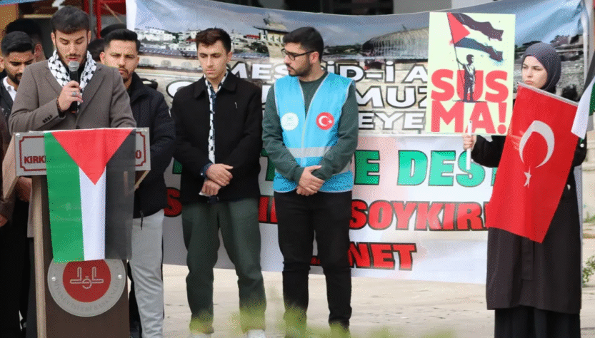 Kırklareli Üniversitesi yerleşkesinde, Filistin ve Gazze’de yaşanan zulme dikkat çekmek amacıyla bir basın açıklaması düzenlendi. Etkinlik, Türkiye Diyanet Vakfı Kırklareli Şubesi ve Kırklareli İl Müftülüğü’nün organizasyonuyla gerçekleştirildi.