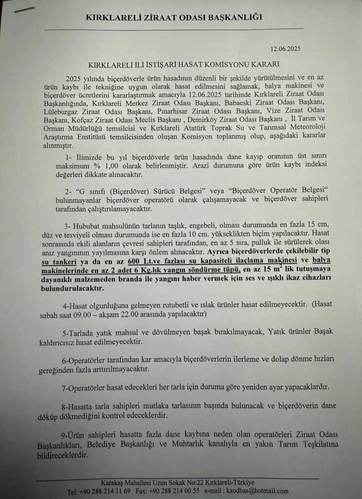 KIRKLARELİ – Kırklareli Ziraat Odası Başkanlığı öncülüğünde toplanan İl İstişari Hasat Komisyonu, 2025 yılı biçerdöver ve balya makinesi hizmetlerine ilişkin uygulama esaslarını belirledi. 12 Haziran 2025 tarihinde yapılan toplantıda, ürün kayıplarının önlenmesi ve hasat sürecinin verimli yürütülmesi amacıyla birçok karar alındı.