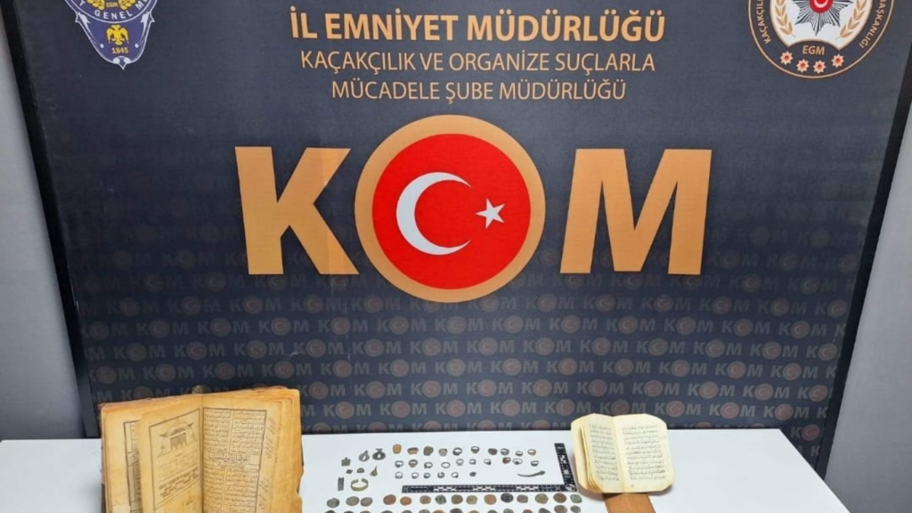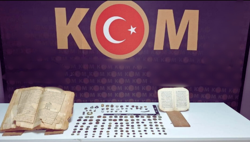 2 Adet tarihi eser olduğu değerlendirilen Arapça Kitap, 130 adet çeşitli boyutlarda sikke, 26 adet yüzük çok sayıda metal başka eserlerde yakalandı. Zanlılar M.Ö, M.A ve E.G gözaltına alınarak savcılığa sevk edildi.